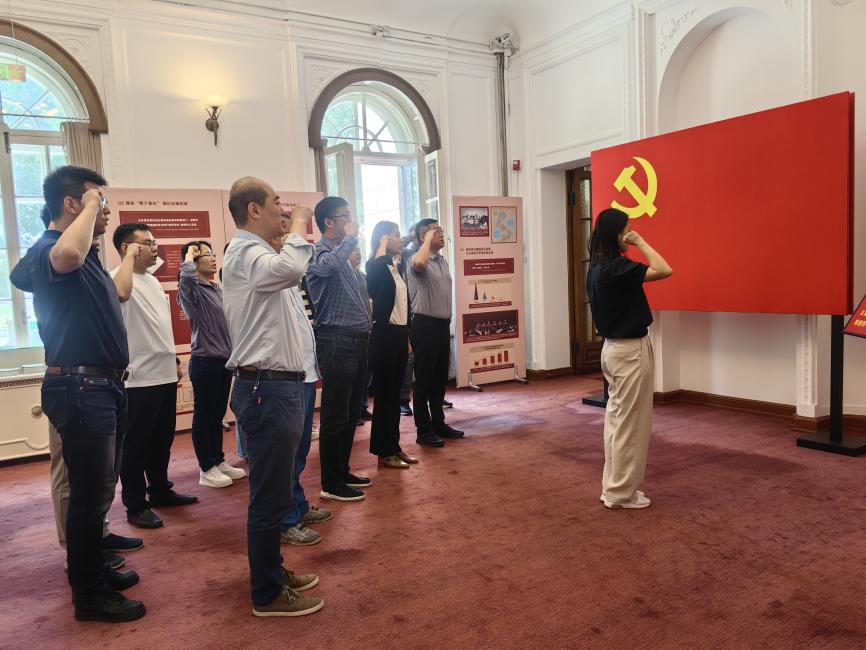 全体成员肃立在鲜艳的党旗前,庄严地举起右拳,在领誓人带领下重温入党誓词,以坚定有力的宣誓声表达对党忠诚、纪律严明的决心和信心。