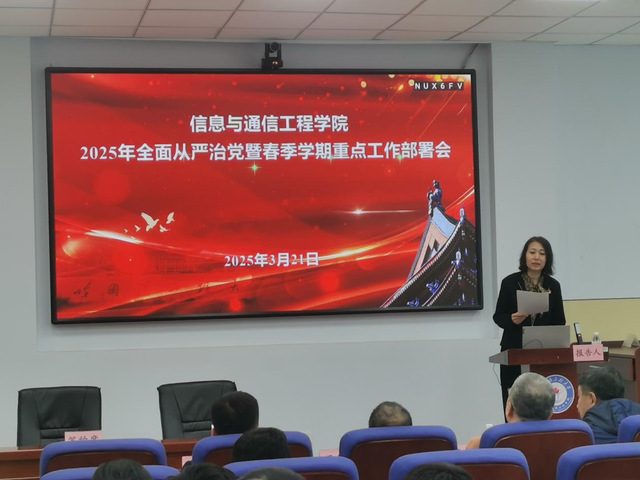 贲晛烨院长以《贯彻落实“五个坚持、五个注重”办学原则 加速助力学校高质量内涵式发展》为题,传达学校春季学期工作会议精神,强调要全面贯彻落实“五个坚持 五个注重”的办学原则,部署学院五大重点任务:一是打造特色学科新高地。以平台大任务为牵引,推进多学科协同创新,建设特色鲜明的信通学科体系,加强专业复合型人才培养。二是构建卓越师资新格局。实施人才强院战略,完善教师发展机制,优化队伍结构,帮助中青年教师加速成长,打造高水平创新型师资队伍。三是开创科研创新新局面。深化产学研用融合,拓展国际合作渠道,构建开放协同的创新生态,提升科研服务能力。四是构建人才培养新体系。深化教育教学改革,创新人才培养模式,强化过程管理,全面提升人才培养质量。五是激发改革发展新动能。完善内部治理体系,优化资源配置机制,营造干事创业良好氛围,为高质量发展提供坚实保障。特别提到学院将全面布局人工智能领域,举办创新论坛,推动AI技术赋能水声、雷达、通信、电磁、集成电路等领域,打造全方位的人工智能创新平台。贲晛烨院长强调,学院以建设“红色信通、学在信通、创新信通、特色信通、名师信通、开放信通、数字信通、幸福信通”的“8个8系”目标为引领,奋力谱写新时代学院高质量发展新篇章,为学校“双一流”建设作出新的更大贡献。